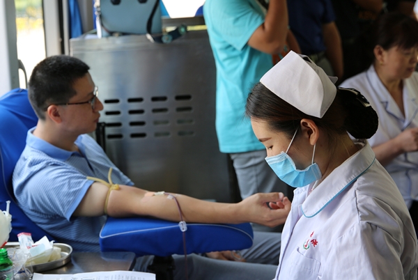 8月17日下午两点,九游会最新地址还没有正式开学,但长清校区一餐厅门口却停着一辆济南市血液中心的采血车,车前排着长长的教工队伍,他们正在等待为同事王宗睿献血。