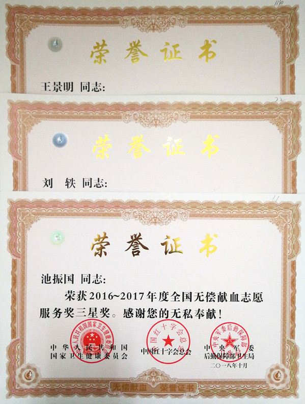 近日,在国家卫生健康委员会、中国红十字会总会、中央军委后勤保障部卫生局等国家部委联合举办的2018年全国无偿献血表彰工作中,我校喜获2016-2017年度“全国无偿献血促进奖单位奖”,生物工程学院辅导员王景明、金融学院辅导员刘轶、材料科学与工程学院辅导员池振国榜上有名,获2016-2017年度“全国无偿献血志愿服务奖三星奖”。